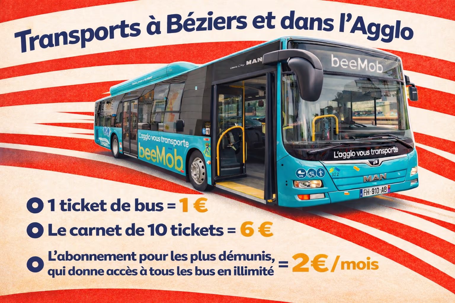 Nous entendons mettre en œuvre une ligne de bus rapide traversant Béziers d’Est en Ouest. Avec des bus toutes les dix minutes aux heures de pointe. Des véhicules à hydrogène et une signalétique qui permettra de connaître l’horaire du prochain passage. Cette ligne sera dotée de deux parkings de délestage gratuits – à ses deux extrémités, près du Pont Vieux et à côté du stade Raoul Barrière – permettant aux automobilistes d’y laisser leur véhicule pour la journée et d’emprunter le bus.